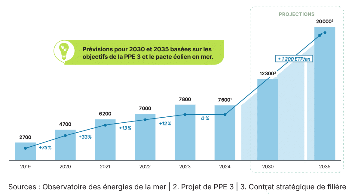 La filière de l’éolien offshore en France représente au 1er janvier 2025 plus de 7800 emplois directs selon le dernier Observatoire des énergies de la mer.