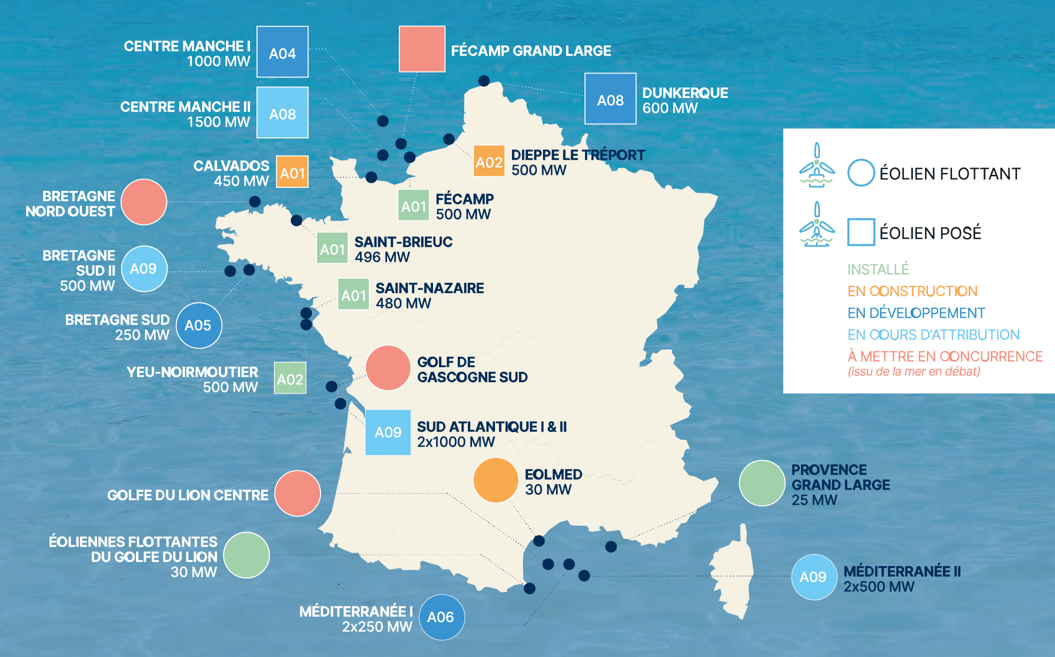 Pour les 2 premiers projets commerciaux en Méditerranée, les zones ont été définies en 2023 au large de la côté narbonnaise (Aude) et du Golfe de Fos (Bouches-du-Rhône). Ces 2 projets d’une puissance unitaire de 250 MW (puis 750MW après extension) seront mis en service à l’horizon 2031. En Bretagne-sud, un autre parc commercial de la même puissance sera également opérationnel d’ici 2031. D’autres appels d’offres devraient être lancé pour réaliser les extension de ces parcs.