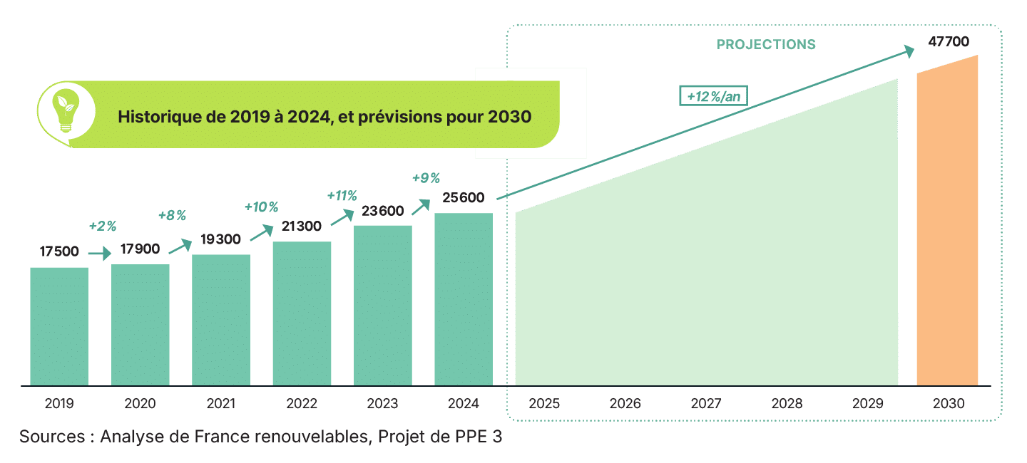 La part relative de l’éolien terrestre dans la consommation électrique nationale d’électricité devrait augmenter dans les 15 années à venir pour représenter un pourcentage allant de 10 à 15% de la consommation totale. En synergie avec les autres énergies bas-carbone, l’éolien terrestre permet d’éviter le recours à des énergies fossiles importés et permet de produire une énergie locale. Pour atteindre les objectifs fixés par la France dans la PPE 3 (jusqu’à 40 GW installés en 2035), il faudra tenir un rythme d’environ 1,6 GW d’éolien supplémentaire installé sur terre chaque année.