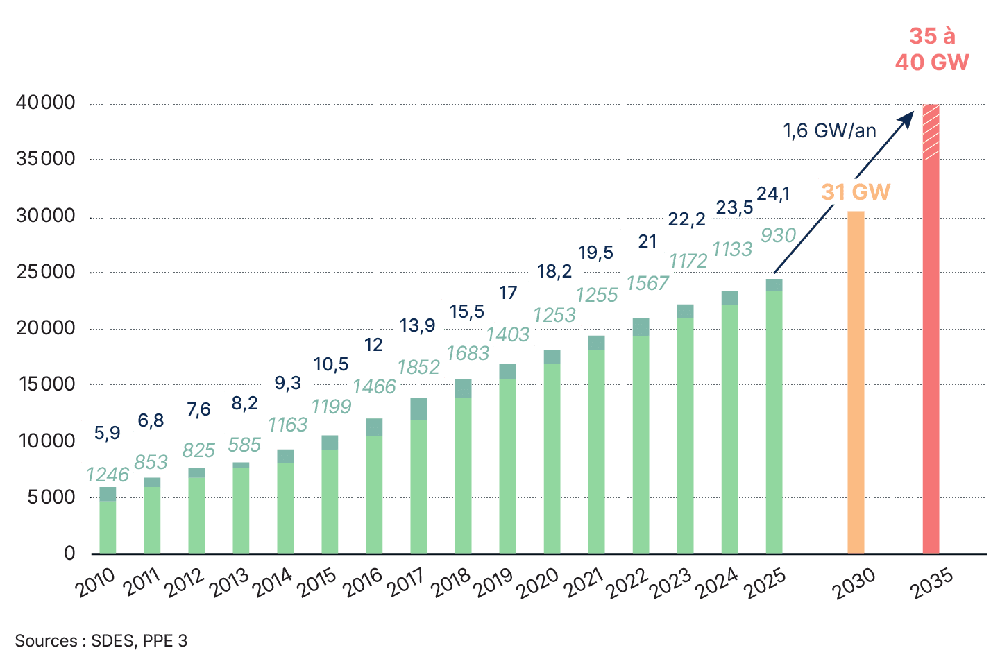 Évolution du parc éolien terrestre (puissance installée totale et incrément annuel), et comparaison avec les objectifs publics de la PPE 3